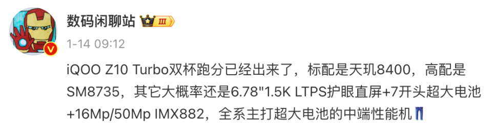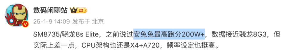 性能预计接近骁龙 8 Gen 3,跑分可能在 200W 出头。