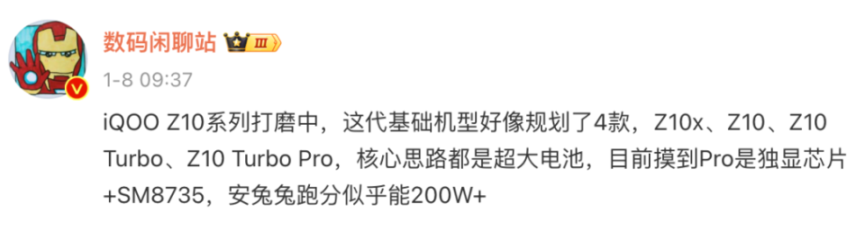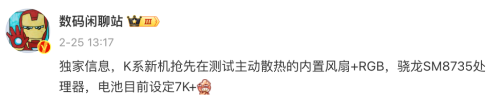 爆料显示,K 系列新机要搭载骁龙 SM8735 处理器(8s 至尊版),跑分翻倍还多。