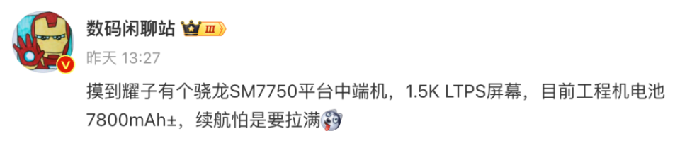 性能方面,这款新机将搭载骁龙 SM7750 平台。