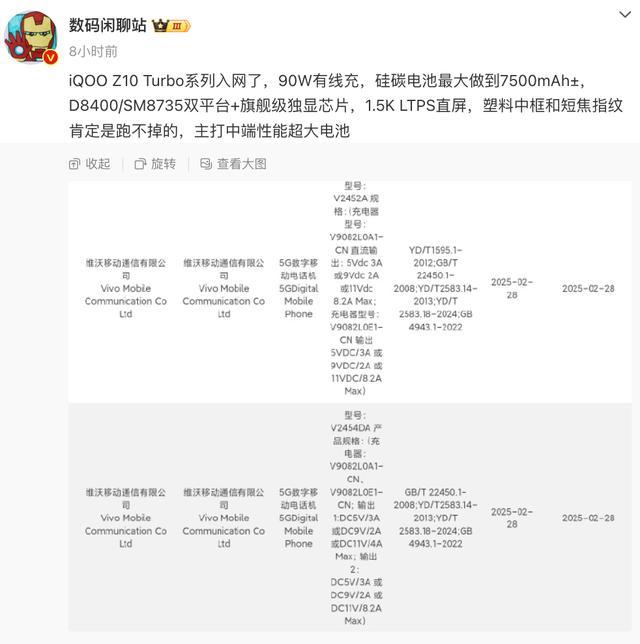 另外,此前的爆料还提到过“iQOO Z10 Turbo系列入网了,90W有线充,硅碳电池最大做到7500mAh±,D8400/SM8735双平台+旗舰级独显芯片,1.5K LTPS直屏,塑料中框和短焦指纹肯定是跑不掉的,主打中端性能超大电池”。