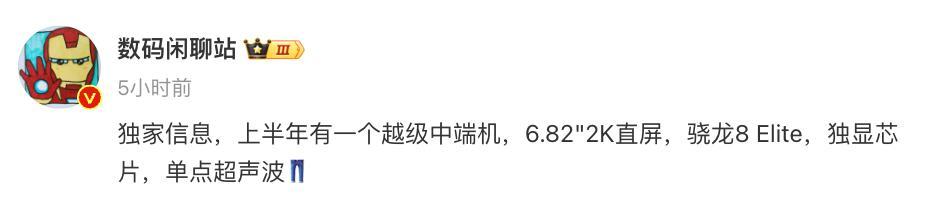 今天博主@数码闲聊站 的一份最新爆料中显示,“独家信息,上半年有一个越级中端机,6.82"2K直屏,骁龙8 Elite,独显芯片,单点超声波”。