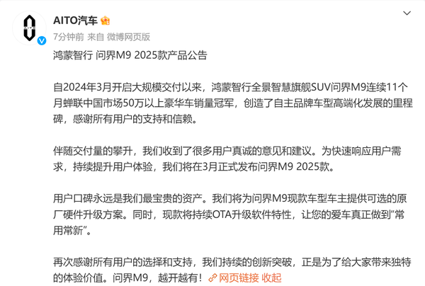 AITO问界汽车官方表示,问界M9的成功离不开广大用户的支持和信赖。在交付量不断攀升的同时,问界汽车也积极听取用户的意见和建议,致力于快速响应用户需求,持续提升用户体验。为此,问界M9 2025款车型将于本月正式发布,以满足更多消费者的期待。