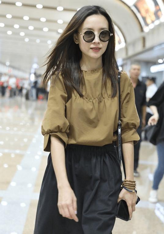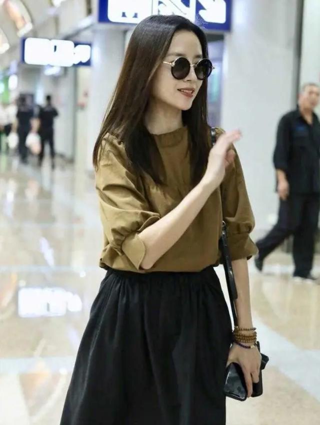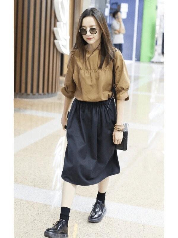 黑色半身裙是每个女生衣橱里的必备单品,董洁选择的这款裙子长度适中,能遮住大腿的肉肉,又不会显得拖沓。搭配美拉德色上衣,形成了“上浅下深”的视觉效果,拉长了身材比例。