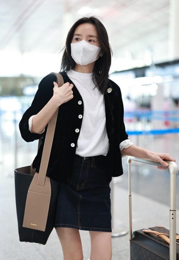 下半身可搭配牛仔裤、阔腿裤、鲨鱼裤都OK,像董洁一样选择搭配百褶短裙更减龄。