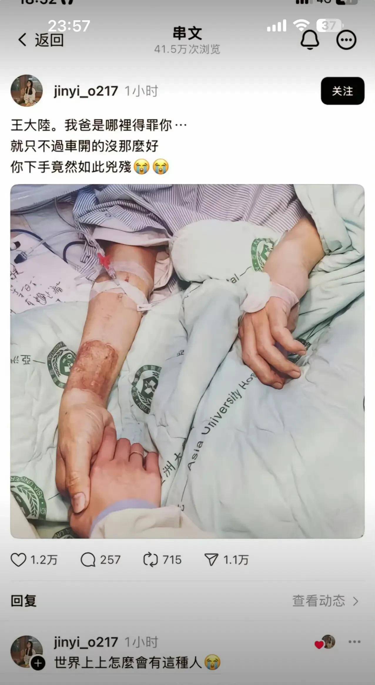 被打司机的女儿发声,晒出爸爸病床输液照片,痛斥王大陆心狠手辣。王大陆的心就是黑的。