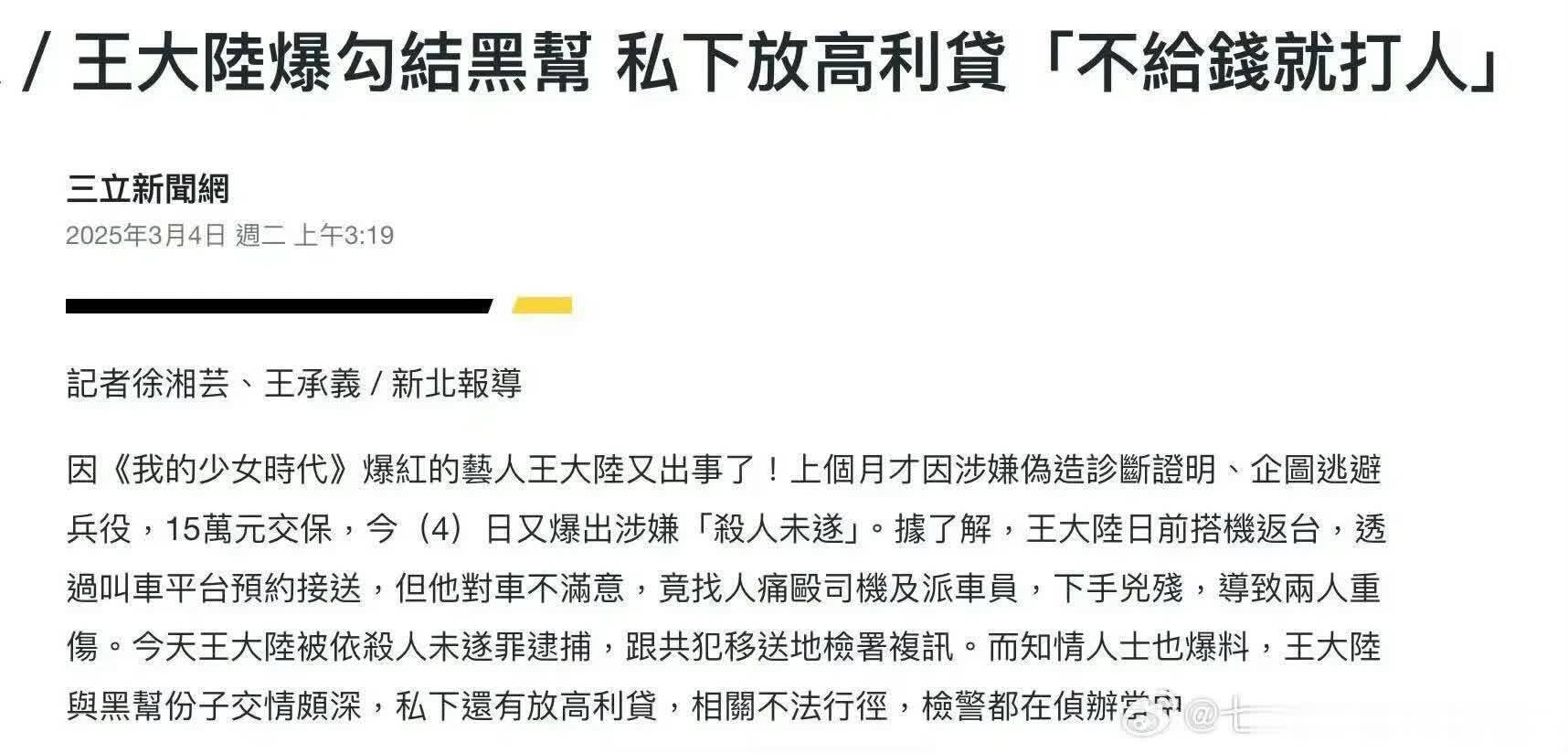 而且还有更炸裂的,台媒报道王大陆涉黑,勾结黑帮,私下放贷,还不上钱就找小弟打人。所以,王大陆对打人如此娴熟,因为他经常做这件事,把打人、虐待别人当做一种乐趣,太可怕了。