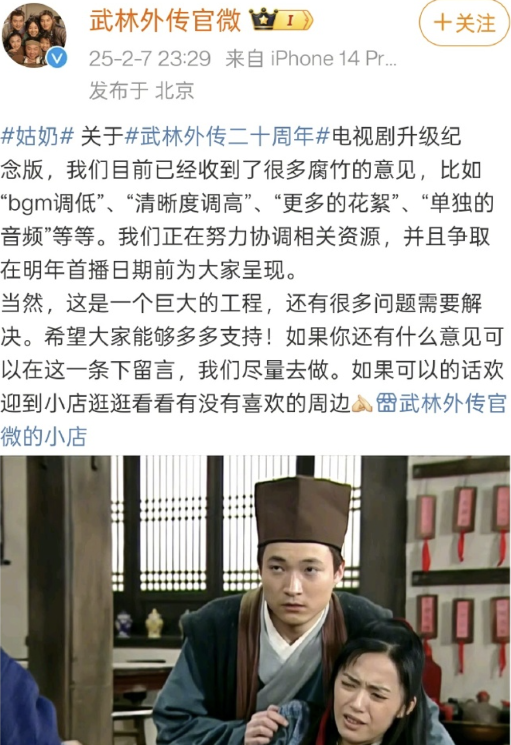 不久前,《武林外传》官方宣布,争取在明年首播日期前呈现上线“20 周年升级纪念版”,包括画质修复、BGM调整、推出单独的音频以及发布更多幕后花絮等,被称为史上最强售后。