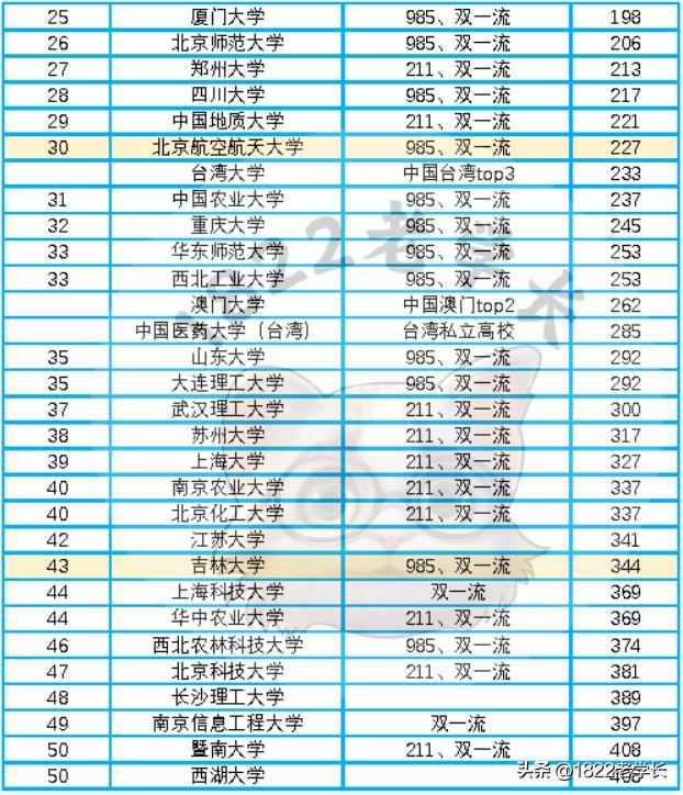 国科大作为一所特殊类型的高校,插入华五中间。国科大是一所高校和中科院院所高度融合的合二为一性质的机构,其实可以看做国科大以及其开设学科对应的中科院院所的结合体。