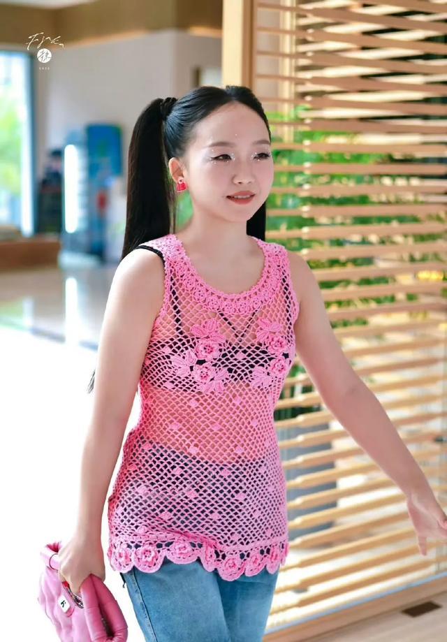 李嘉琦选择了一件镂空设计的粉色吊带衫,内搭黑色打底,既保留了粉色的甜美,又通过黑色打底的加入增添了一丝性感。
