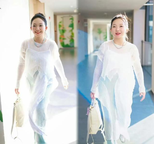 白色是李嘉琦喜欢的色彩之一,她选择了一款白色透视感长款不规则裙摆长裙搭配蓝色喇叭裤。白色与蓝色的搭配,清新脱俗,给人一种优雅大方的感觉。