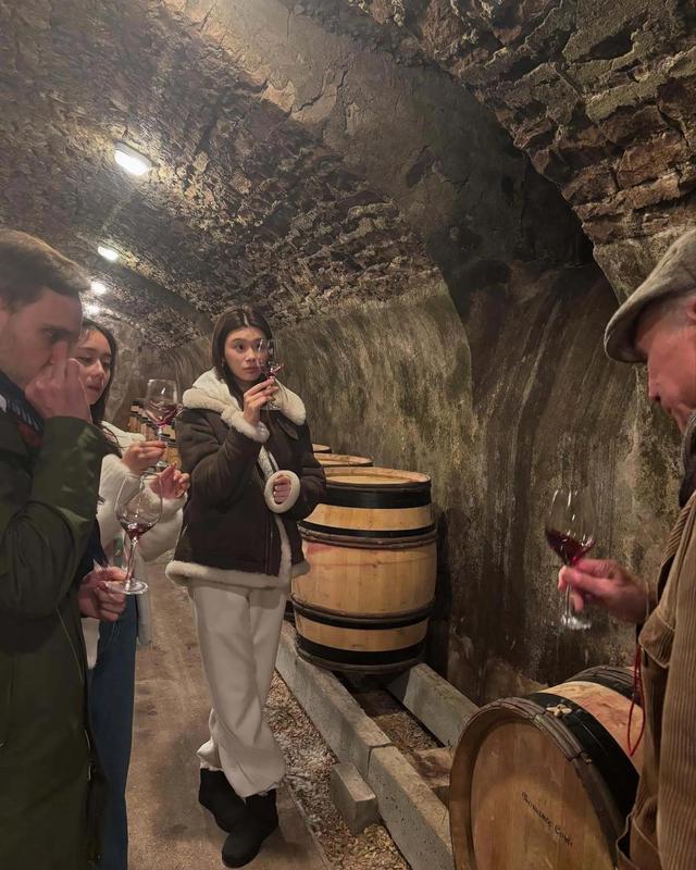 内搭白色羽绒马甲背心和白色翻领针织衫,下半身搭配白色裤子,脚上搭配了一双黑色雪地靴,搭配了白色爱马仕单肩斜挎包。整体穿搭色系简约,简约的棕色系和白色系,搭配出温柔感!奚梦瑶一边参观酒窖,一边摇晃着红酒杯,听的相当认真,温柔可爱。