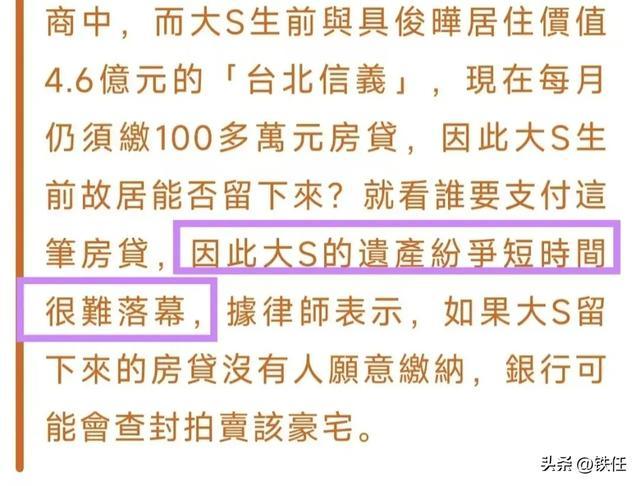 大S遗产案再起风波白山股票配资,据台媒最新报道,鉴于大S的一对儿女还没有支付能力,作为唯一成年继承人,具俊晔必须支付目前所住豪宅的余下房贷,这样下来,他就没有多大赚头了,“具划算”的名号要摘下来了。