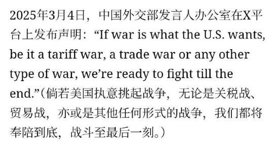 中方已经强调,如果美方执意打关税战、贸易战或者别的什么战,中方将奉陪到底。