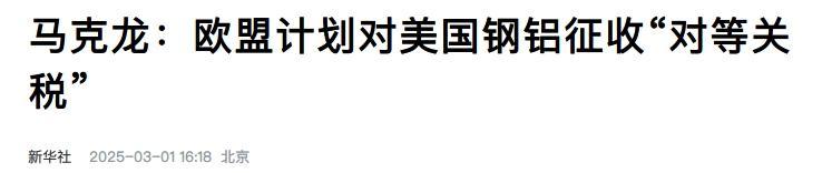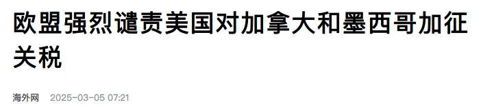 加拿大和墨西哥联动搞的这一波梯度反攻,大大出乎特朗普政府意料。这俩怎么非但不投降,还胆敢还击呢?除了加墨两国,其他组织和国家也纷纷下场站台,欧盟委员会发言人就代表欧盟进行了强烈谴责,现在是什么时刻?是“国际合作比以往任何是时候都更加重要的时刻”,你这么一搞,我们这些盟友都要受伤都是次要的,全球贸易都可能被搞乱诶!必须予以强烈谴责!欧盟委员会主席冯德莱恩和法国总统马克龙也说了,但凡敢对欧盟收税,我们欧盟必然也会反击滴!瘦死的骆驼比马大,让你看看谁会怕!